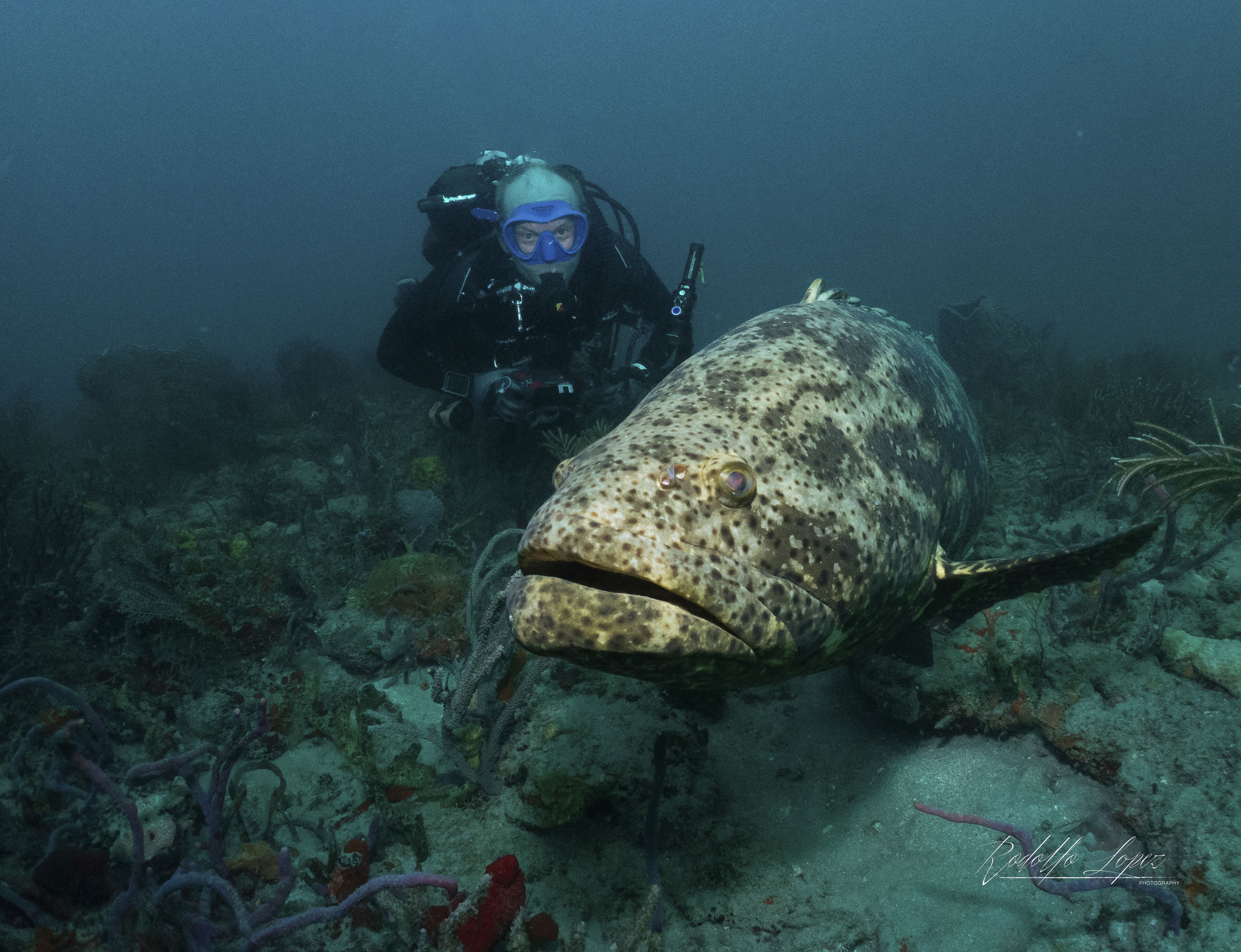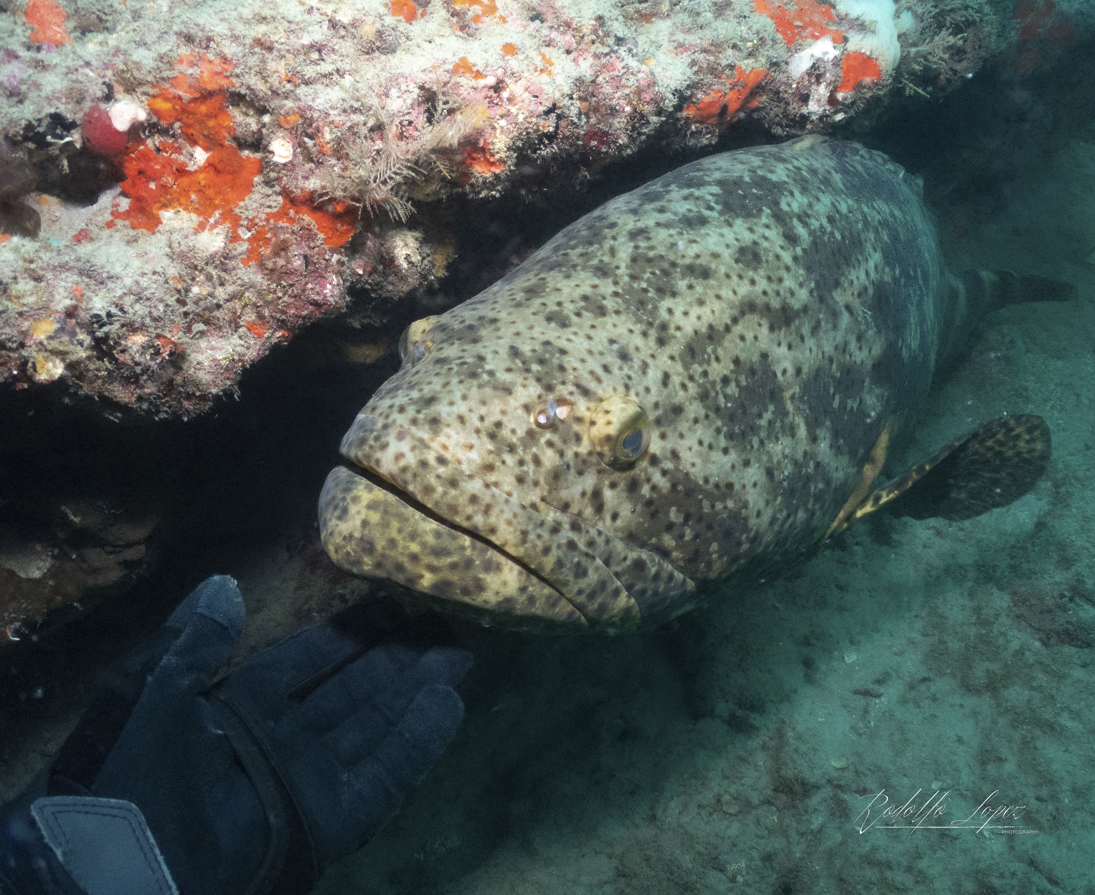 Once the show subsided, it was time for our second dive. Dropping down, we were immediately welcomed by a massive, charismatic Goliath Grouper, Jasper —the friendliest one I’ve ever met! This 200-300 lb giant had the playful demeanor of a puppy, gliding right up to divers and practically asking for attention. When the Dive Master tapped her tank, the grouper approached for what can only be described as a belly scratch session, lingering patiently so that each diver could have a turn.