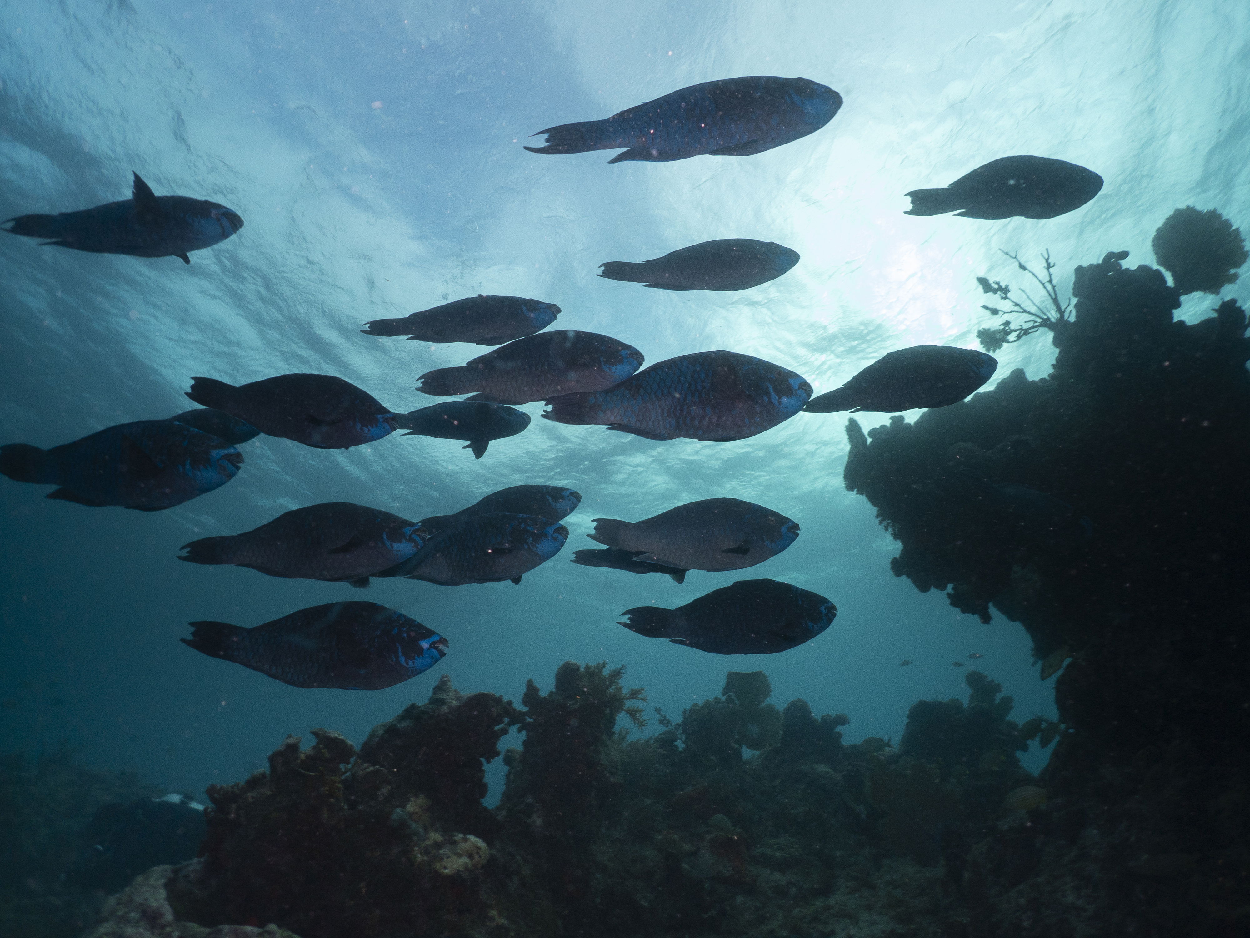 Gray skies and rolling seas set the stage for our first dive of the day at Hole in the Wall, one of Molasses Reef’s classic sites. The boat rocked gently in the 3–4 foot swells as we geared up, the horizon blurred by a soft, steady overcast. Visibility wasn’t stellar, but there was just enough clarity to make out the reef’s distinctive contours as we descended into the muted blue. Even under the clouds, the reef pulsed with life. Schools of yellowtail snapper and grunts drifted in and out of view, their silver sides catching the faint sunlight that filtered down. Coral heads and swim-throughs could be found throughout the site filled with sheltering fish. A large school of midnight parrotfish marched their way across the reef picking at parts of the coral as they made their way. It wasn’t the calmest dive, but it carried that quiet satisfaction of exploring a site that reveals its beauty even when the weather isn't ideal.